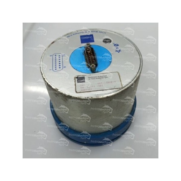 WEKO 202210 is a phase rotary sensor used in Miller TP74 printing presses. It monitors rotational position and speed, ensuring precise synchronization and coordination of components for accurate printing and preventing misfeeds